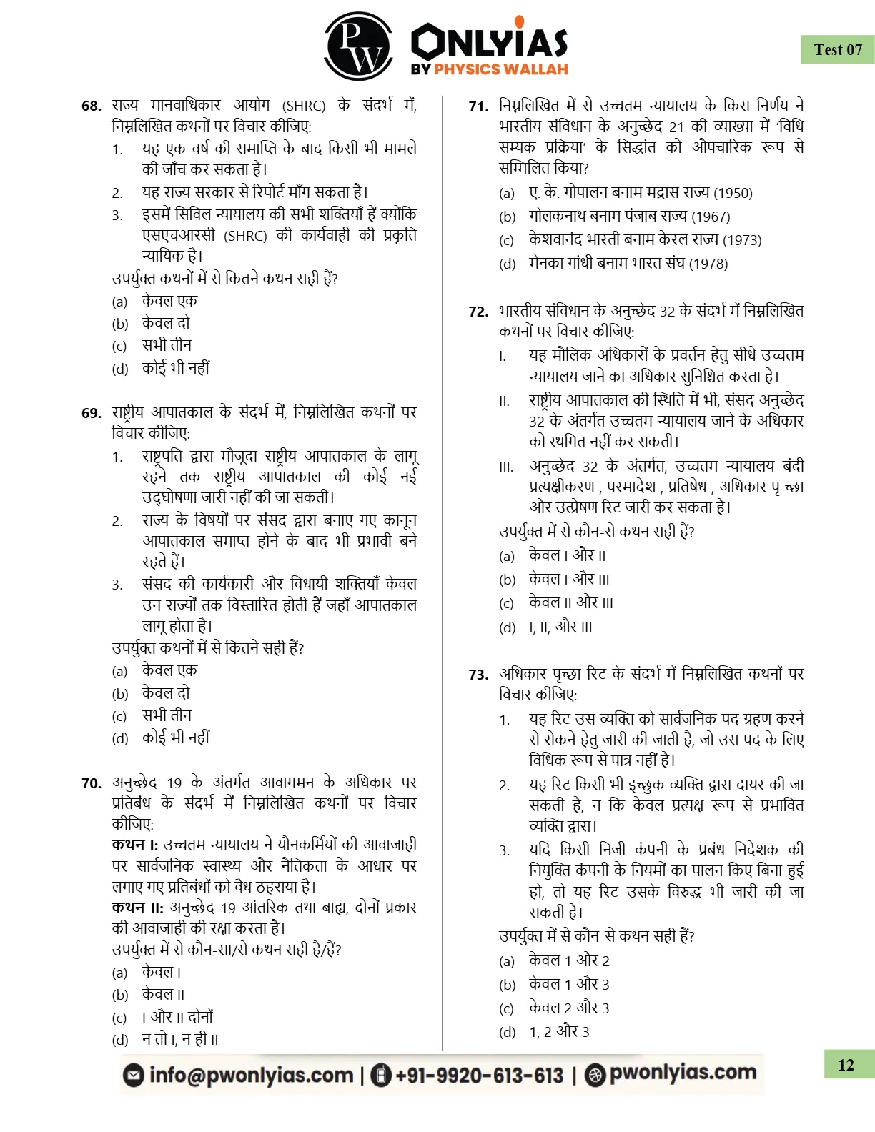 The PW Only IAS Prelims Test Series is an essential resource for candidates aiming to excel in the UPSC Prelims. With a focus on the Hindi language, this series is particularly beneficial for Hindi-speaking aspirants. The tests are structured to cover a wide range of topics, ensuring that you are well-prepared for the actual examination. Each test is crafted with precision, reflecting the latest exam patterns and trends, which helps candidates familiarize themselves with the types of questions they may encounter.